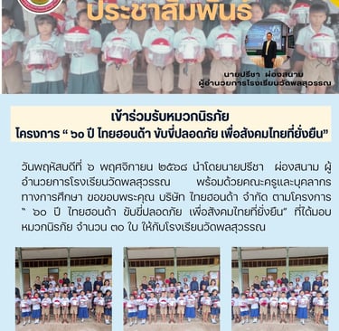 วันพฤหัสบดีที่ ๖ พฤศจิกายน ๒๕๖๘ นำโดยนายปรีชา ผ่องสนาม ผู้อำนวยการโรงเรียนวัดพลสุวรรณ พร้อมด้วยคณะครูและบุคลากรทางการศึกษา ขอขอบพระคุณ บริษัท ไทยฮอนด้า จำกัด ตามโครงการ “ ๖๐ ปี ไทยฮอนด้า ขับขี่ปลอดภัย เพื่อสังคมไทยที่ยั่งยืน” ที่ได้มอบหมวกนิรภัย จำนวน ๓๐ ใบ ให้กับโรงเรียนวัดพลสุวรรณ