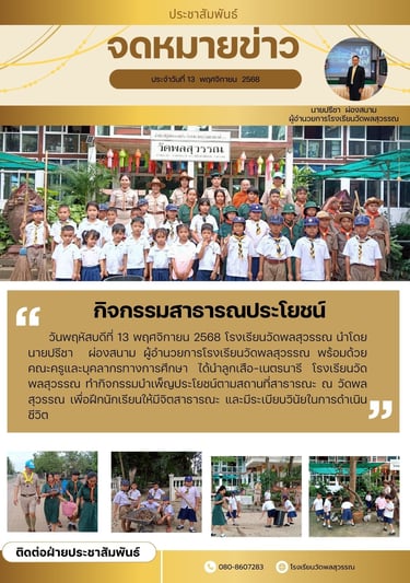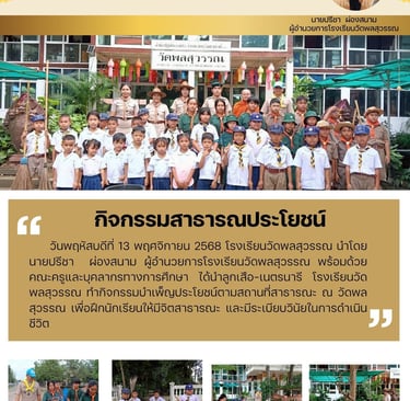 วันพฤหัสบดีที่ 13 พฤศจิกายน 2568 โรงเรียนวัดพลสุวรรณ นำโดย นายปรีชา ผ่องสนาม ผู้อำนวยการโรงเรียนวัดพลสุวรรณ พร้อมด้วยคณะครูและบุคลากรทางการศึกษา ได้นำลูกเสือ-เนตรนารี โรงเรียนวัดพลสุวรรณ ทำกิจกรรมบำเพ็ญประโยชน์ตามสถานที่สาธารณะ ณ วัดพลสุวรรณ เพื่อฝึกนักเรียนให้มีจิตสาธารณะ และมีระเบียบวินัยในการดำเนินชีวิต