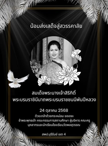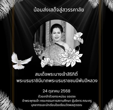 โรงเรียนวัดพลสุวรรณ ขอร่วมถวายความอาลัยอย่างหาที่สุดมิได้ แด่ สมเด็จพระนางเจ้าสิริกิติ์ พระบรมราชินีนาถ พระบรมราชชนนีพันปีหลวง ปวงข้าพระพุทธเจ้า ขอน้อมสำนึกในพระมหากรุณาธิคุณอันหาที่สุดมิได้ ตลอดพระชนมชีพ พระองค์ทรงอุทิศพระวรกายเพื่อบำเพ็ญพระราชกรณียกิจนานัปการ ทั้งด้านการศึกษา ศิลปวัฒนธรรม การอนุรักษ์สิ่งแวดล้อม และการส่งเสริมอาชีพแก่พสกนิกรทั่วทุกภูมิภาค นับเป็นพระมหากรุณาธิคุณอันยิ่งใหญ่ที่ปวงชนชาวไทยจะจารึกไว้ในดวงใจตราบนิจนิรันดร์ “ขอพระองค์เสด็จสู่สวรรคาลัย ด้วยความสงบสถาพรและเกียรติยศอันสูงสุด” ด้วยเกล้าด้วยกระหม่อมขอเดชะ ข้าพระพุทธเจ้า คณะกรรมการ ผู้อำนวยการสถานศึกษา และบุคลากรทางกาศึกษา โรงเรียนวัดพลสุวรรณ
